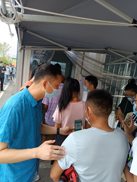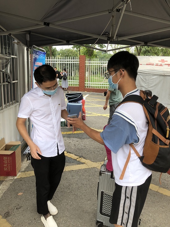 在值守期间,值班人员分成体温检测和个人健康行程码查验两组,各站其位,各司其职,积极主动对每一位入校人员进行体温测量、个人健康码、行程码、省外出行人员的48小时的核酸检测报告进行仔细的查验,帮助新生搬运行李使其顺利入校。