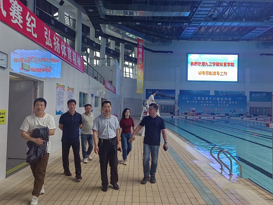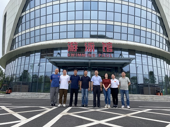 在湖口县体育中心,段宝斌一行走访调研江西省少儿体育培训中心,中心主任刘晓青、副主任熊莉红、训练科科长何超、业务科科长谢婷婷等领导热情接待来访。双方就场馆运营、实习就业、救生员培训等方面进行了深入研讨和交流。