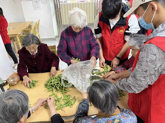 在养老中心,志愿者们自行分工、各司其职。烹饪菜肴、种植花草、卫生扫除、田间劳作、切磋才艺、倾听陪伴……同学们将养老中心作为劳动教育的主阵地,用爱心、耐心和细心给老人们带来幸福感,整个敬老院萦绕着爱的暖流,场面温馨感人。