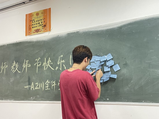 学院于9月10日晚组织了“一朝沐杏雨,一生念师恩”的教师节主题班会。在班会上,同学们通过赠送鲜花、手工礼物和便签条留言等形式,向老师们表达着最真挚的祝福。便签条上写着“感恩在最火热的青春里遇到最美的老师”“老师,您辛苦了”等祝福的话语,无不流露出同学们对师恩的感激和赞美。