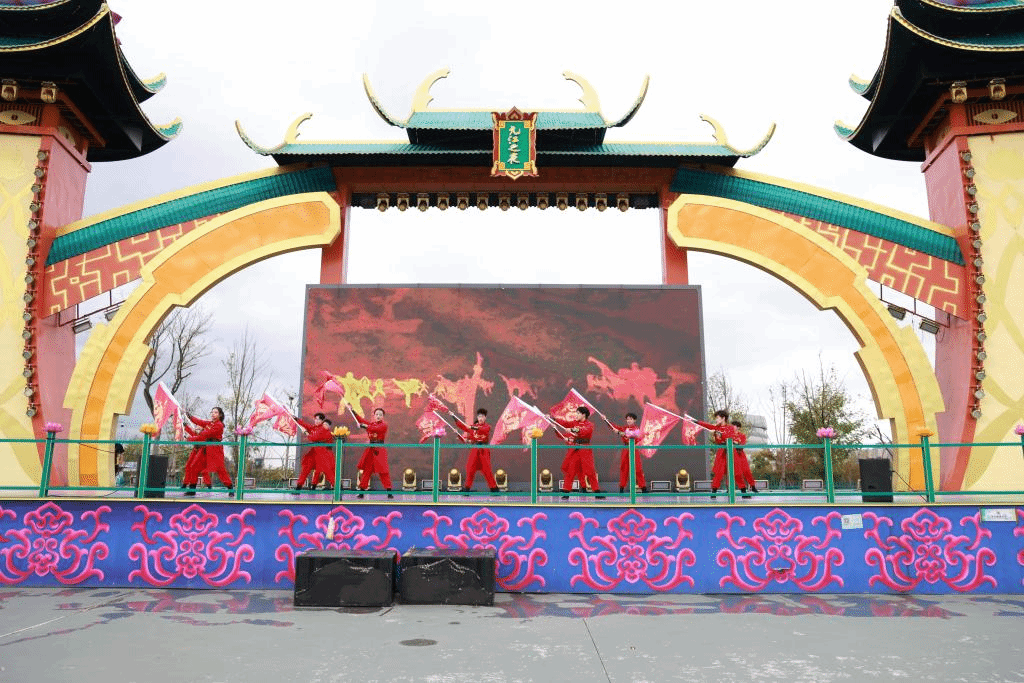 伴随《武林风》背景音乐,表演正式拉开帷幕。队员们高举龙旗从舞台两侧如潮水般涌上,龙旗舞动,旗声阵阵,如惊雷劈落,活灵活现。紧接着,武术队大师兄从舞台侧边飞跃登台,手中九节鞭在其精湛演绎下,如行云流水,瞬间震撼全场。随后,其他队员手持长刀,步伐整齐,吼声嘹亮,扎刀动作干净利落,尽显磅礴气势与自强不息的武术精神。
