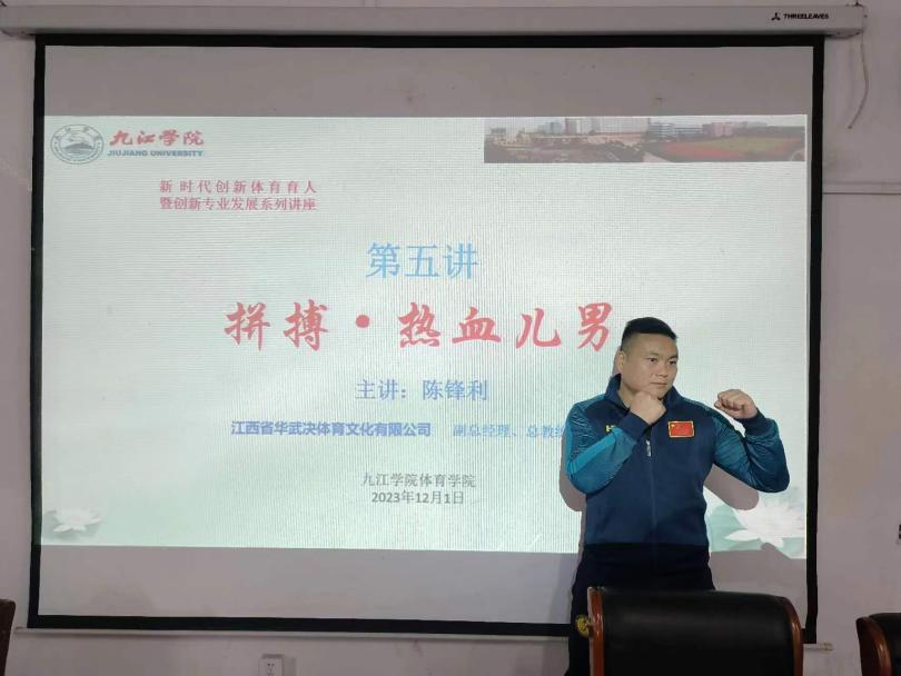 讲座深入浅出介绍了体育教育培训职业生涯的一般情况,分析了搏击运动对养成血性男儿拼搏精神的影响,展示了九江警校教练的训练片段,播放了《武林风》搏击赛事的精彩视频。最后,分享了潜心钻研的传统武术与现代散打搏击相结合的训练方法。