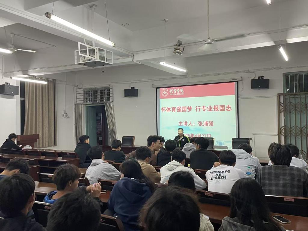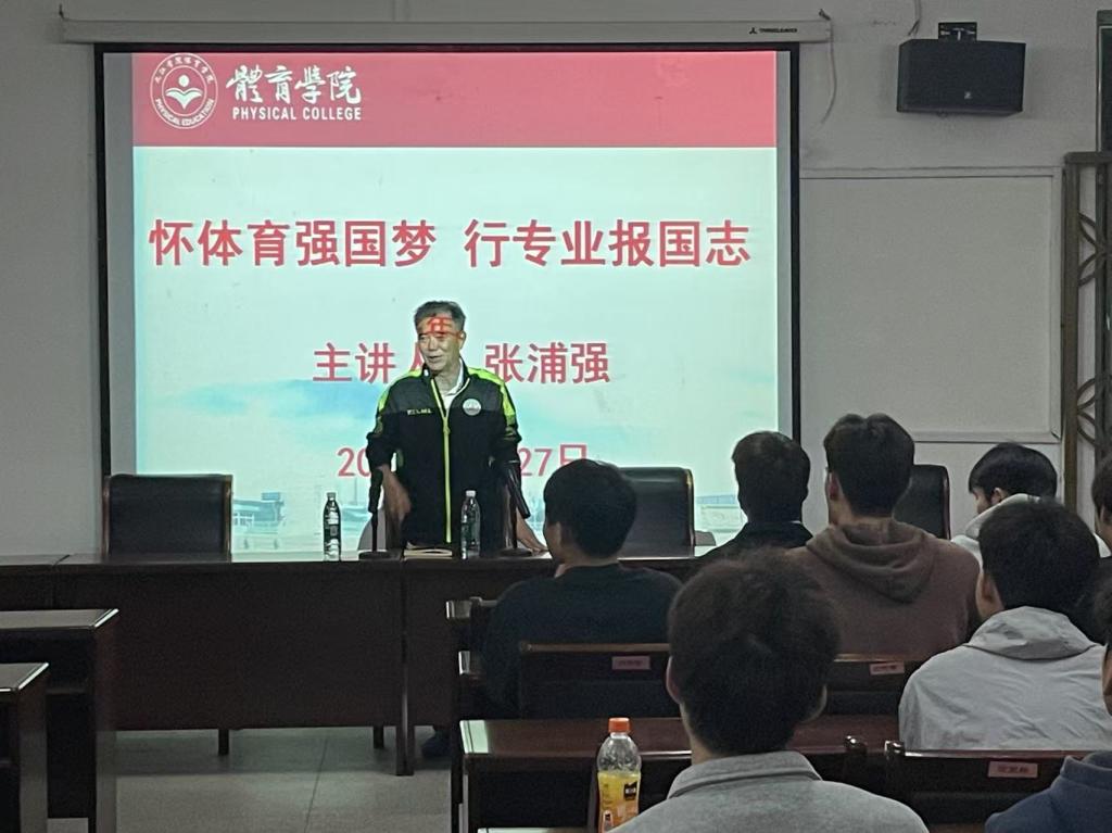 为深入贯彻落实体育强国战略,充分发挥老同志在关心下一代工作中的积极作用,4月27日晚,beat365亚洲版官网在向学楼301会议室举办“怀体育强国梦,行专业报国志”主题讲座。本次讲座邀请到校关工委委员、“五老”成员、原beat365亚洲版官网党委书记张浦强同志作专题辅导,学院足球专项教师卢波博士以及足球专项60余名同学到场聆听。