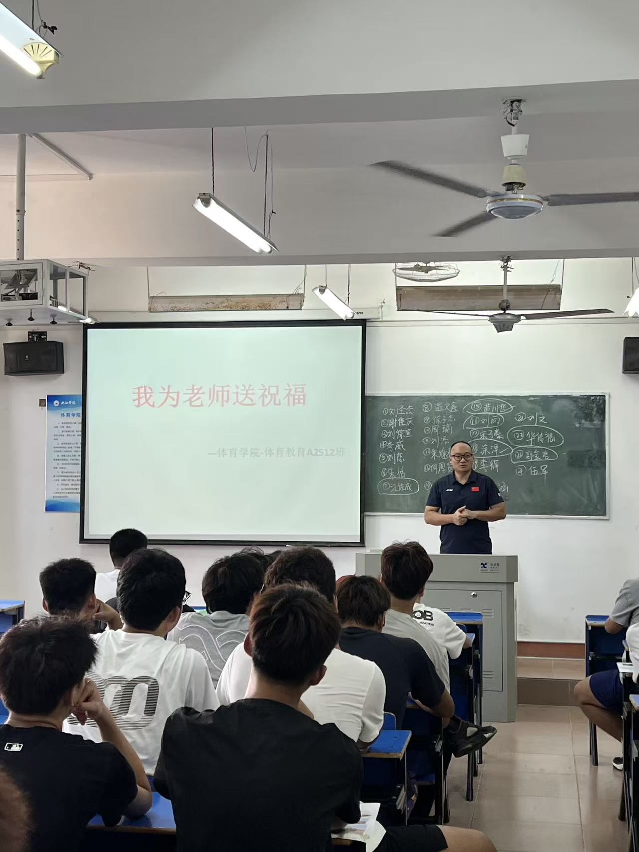 班会前,各班提前布置场地,有多媒体设备的班级在幕布上清晰展示“我为老师送祝福”标题,营造出温馨的感恩氛围。班会上,有的同学分享入学后与老师的暖心故事,讲述老师在训练指导、学业答疑中的耐心帮助;有的班级集体书写贺卡,一笔一划倾注祝福;还有的小组编排简短体育特色手势舞,以活力姿态传递感恩。