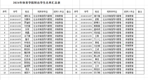 根据《beat365亚洲版官网学生转专业管理办法(试行)》九院字【2024】111号文件的规定,经过学生本人申请,且申请转出人数符合学校的规定,拟批准2024级社会体育指导与管理专业的36名学生转出申请,公示名单如下: