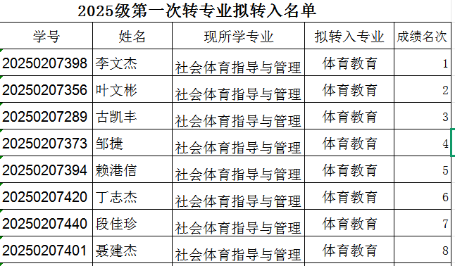 根据《beat365亚洲版官网学生转专业管理办法(试行)》九院字【2024】111号文件精神,体育教育专业的转入计划采用考核的方式,按照考核成绩从高分到低分确定拟转入名单,拟批准2025级社会体育指导与管理专业的8名学生拟转入体育教育专业,名单公示如下: