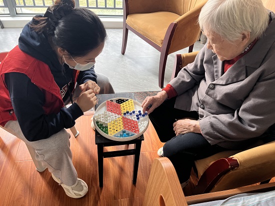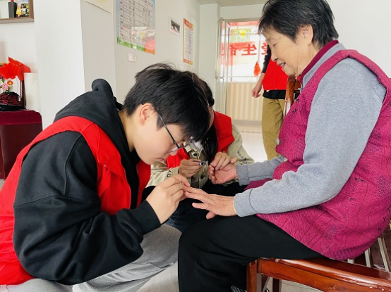 在养老院,同学们分工合作,打扫房间、帮修剪指甲、清扫庭院、帮助后厨洗菜,陪爷爷奶奶散步、聊天、下棋、做保健操。老人们看到青春洋溢、活力四射的同学们笑逐颜开,讲述院内的日常生活,同学们分享校园内趣事,有问有答,有来有往,现场笑语不断,其乐融融,院内流淌着爱的暖流,同学们用真诚的陪伴,为养老中心送去了秋日的温暖,丰富了他们的精神文化生活。