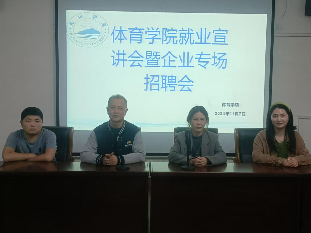 为深入贯彻落实党中央、国务院关于做好大学生就业工作的决策部署。11月7日晚,beat365亚洲版官网邀请九江瑞迪体育管理有限公司、九江九州体育发展有限公司负责人进校园为2025届毕业生开展就业宣讲会暨企业专场招聘会活动。