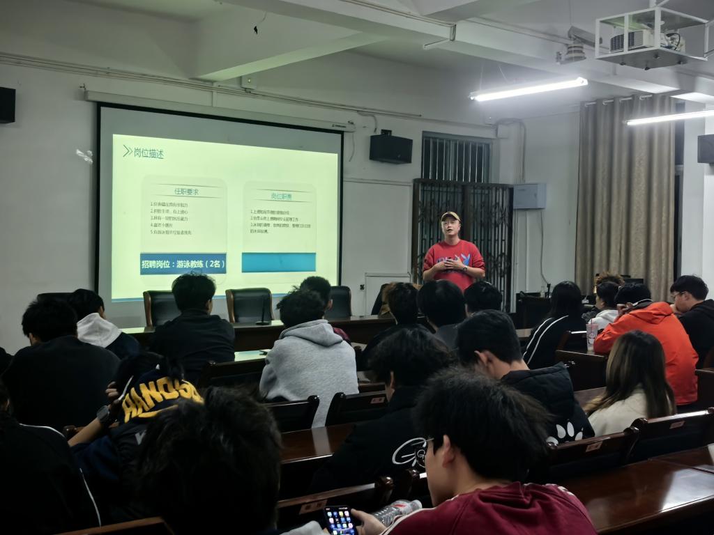 活动现场,企业代表围绕行业发展趋势结合江西本地体育产业发展态势展开深度宣讲,介绍游泳教练、场馆运营管理、少儿游泳课程研发等方面岗位要求,讲解了企业核心岗位的招聘需求、任职标准及薪资福利体系。企业资深教练分享一线教学经验,针对游泳技能实操、资质认证流程、客户沟通技巧等问题提供实操指导,同时细致解答同学们关于简历优化、面试礼仪等方面的疑问。